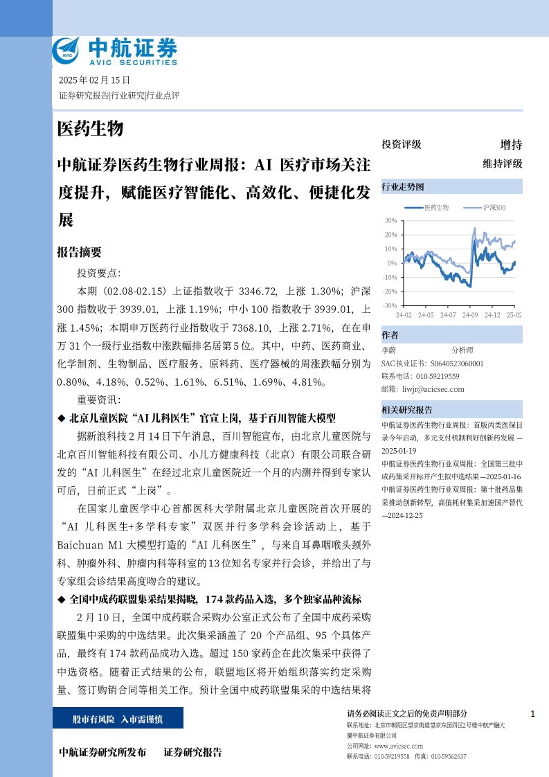 2025-02-17-中航证券--医药生物行业周报:AI医疗市场关注度提升,赋能医疗智能化、高效化、便捷化发