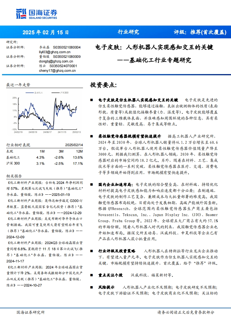 基础化工行业专题研究:电子皮肤:人形机器人实现感知交互的关键