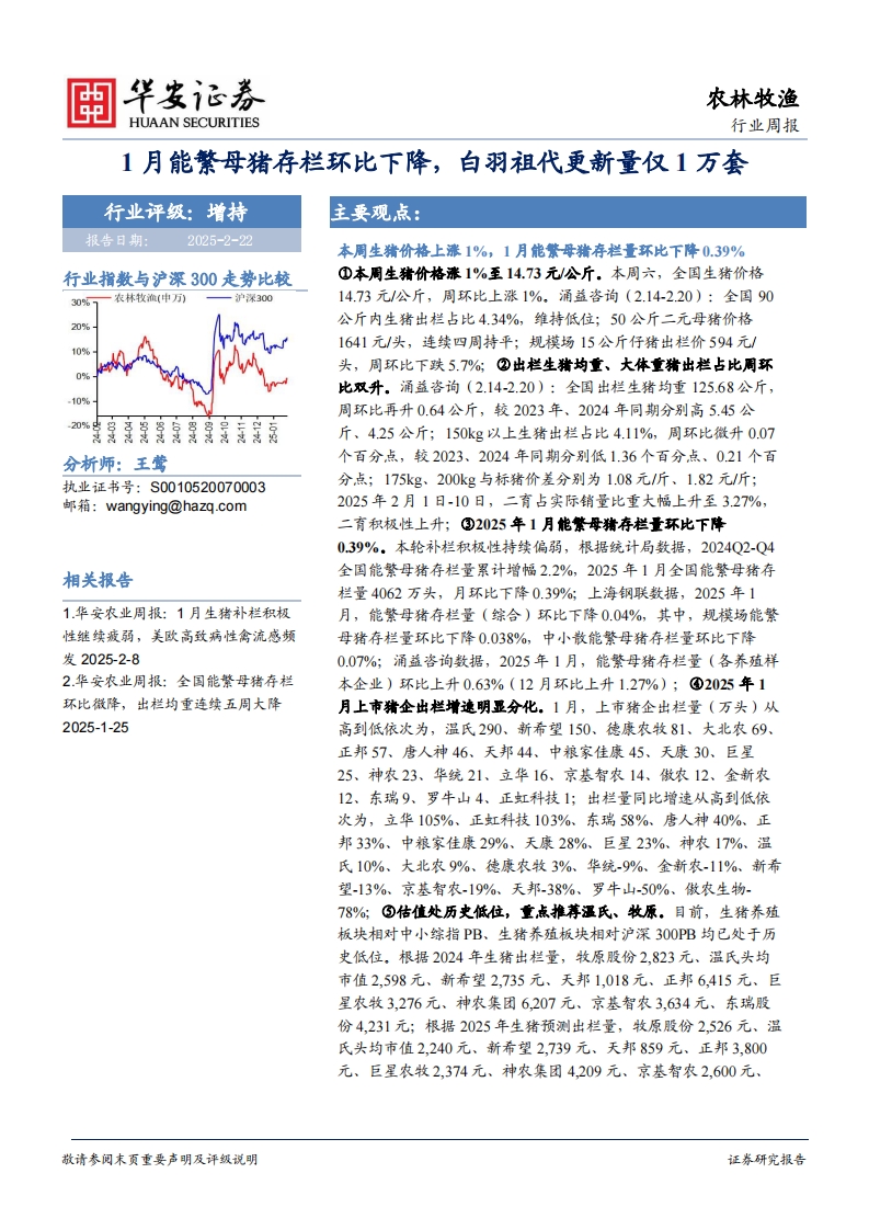 2025-02-24-华安证券-农林牧渔行业周报:1月能繁母猪存栏环比下降,白羽祖代更新量仅1万套