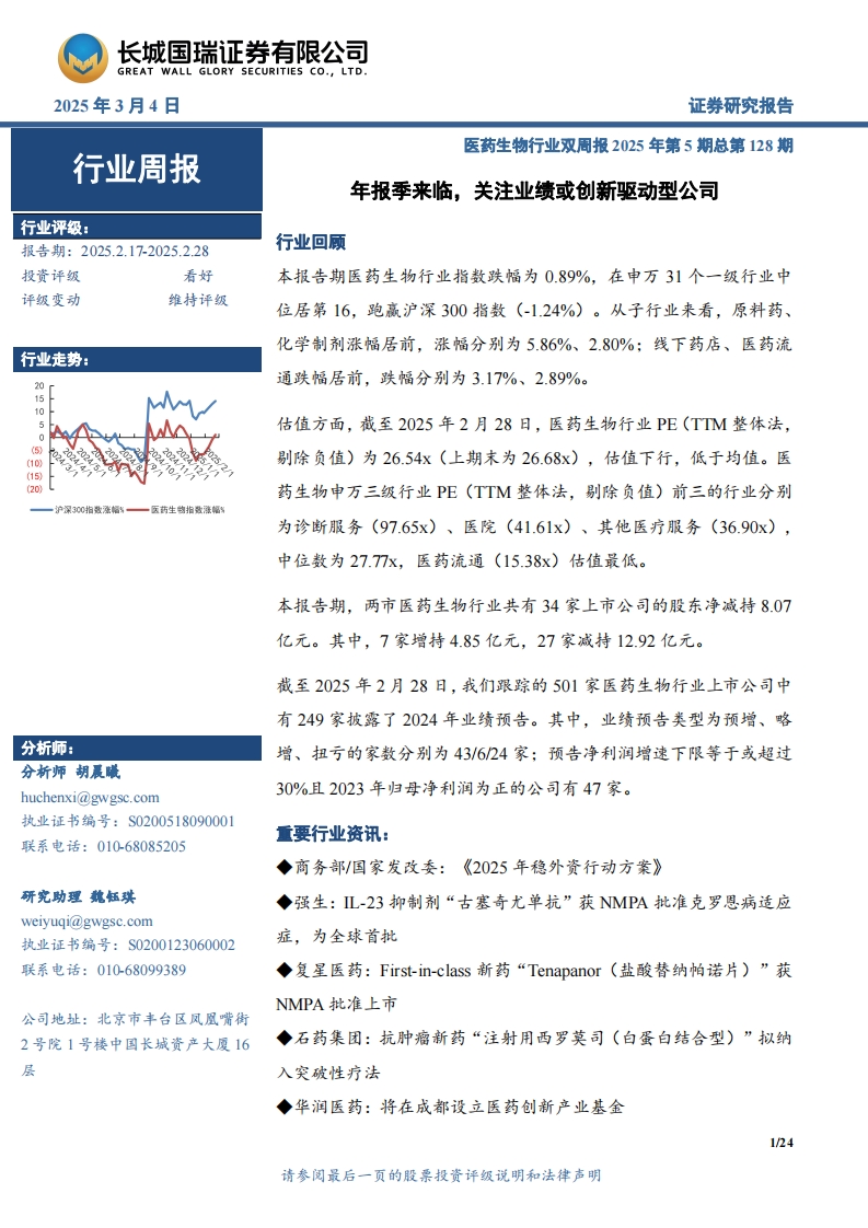2025-03-04-长城国瑞证券--医药生物行业双周报2025年第5期总第128期:年报季来临,关注业绩或创新驱动型公司