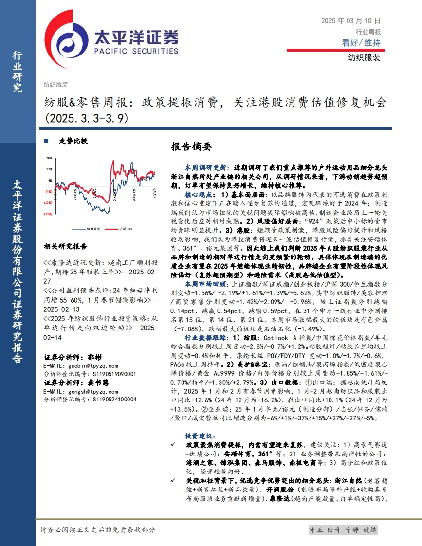 2025-03-10-太平洋--纺服&零售行业周报:政策提振消费,关注港股消费估值修复机会(2025.3.3-3.9)