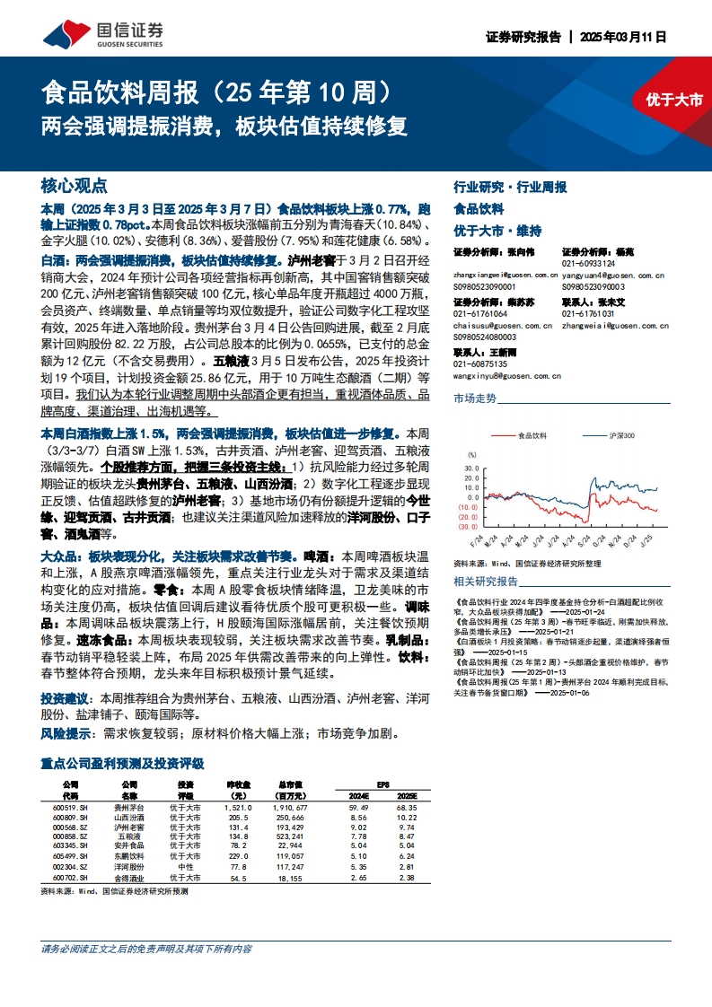 2025-03-11-国信证券--食品饮料周报(25年第10周):两会强调提振消费,板块估值持续修复