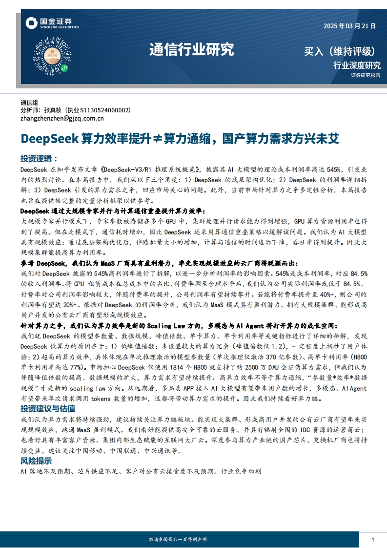 2025-03-21-国金证券--通信行业研究:DeepSeek算力效率提升≠算力通缩,国产算力需求方兴未艾