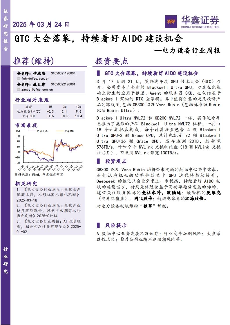 2025-03-24-华鑫证券--电力设备行业周报:GTC大会落幕,持续看好AIDC建设机会