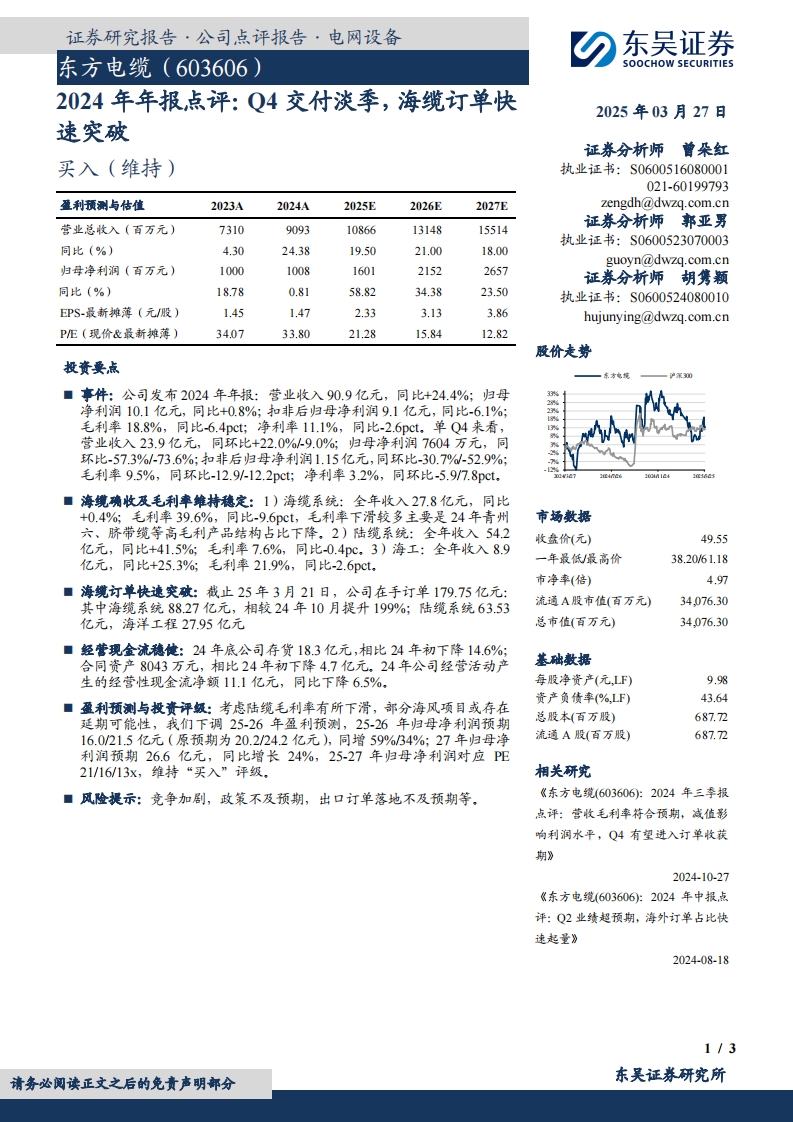 2025-03-27-东吴证券-东方电缆-2024年年报点评:Q4交付淡季,海缆订单快速突破