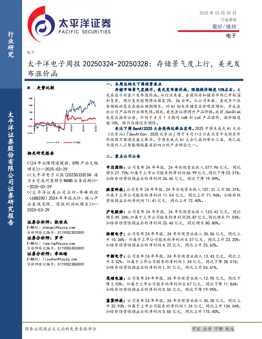 2025-03-31-太平洋--电子行业周报:存储景气度上行,美光发布涨价函