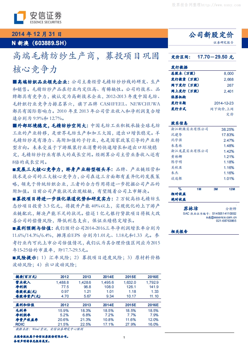 20141231-安信证券:新澳股份-高端毛精纺纱生产商,募投项目巩固核心竞争力-20页