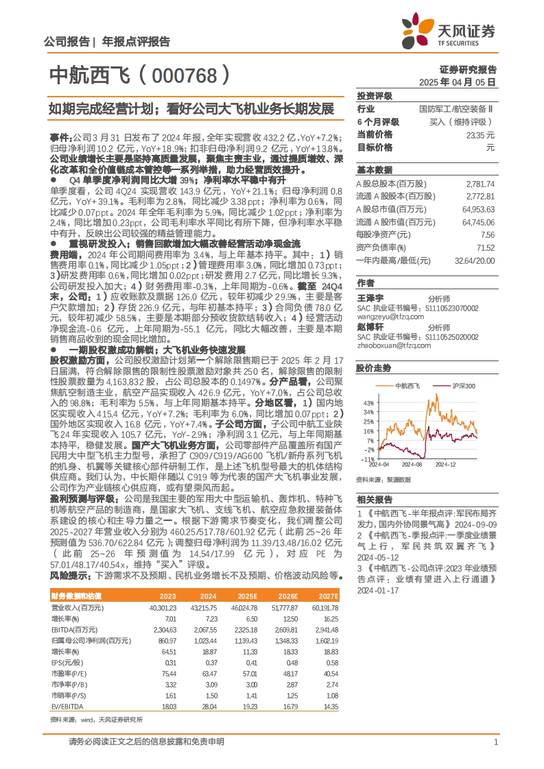 2025-04-06-天风证券-中航西飞-如期完成经营计划;看好公司大飞机业务长期发展