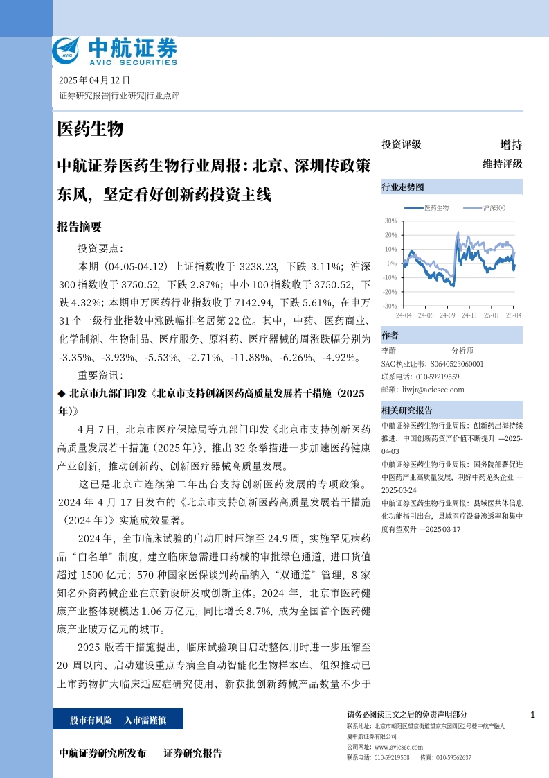 2025-04-14-中航证券--医药生物行业周报:北京、深圳传政策东风,坚定看好创新药投资主线