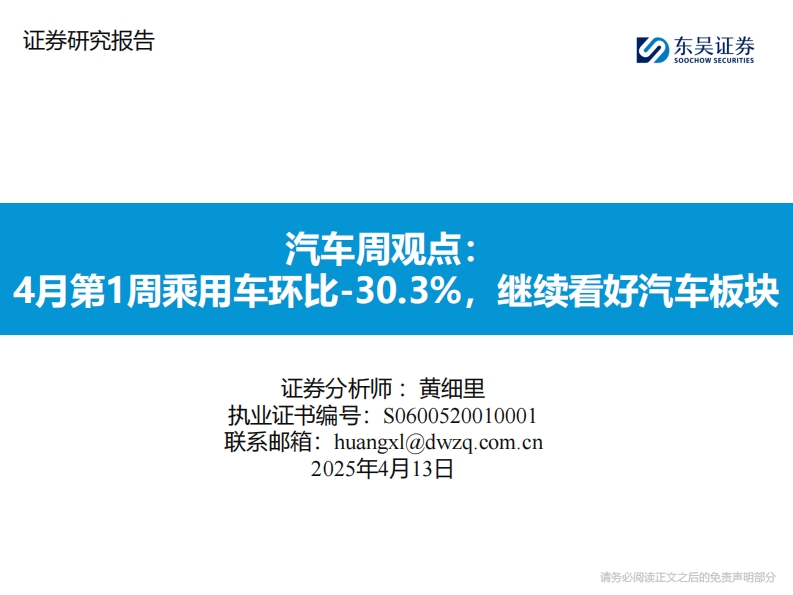 2025-04-16-东吴证券--汽车周观点:4月第1周乘用车环比-30.3%,继续看好汽车板块