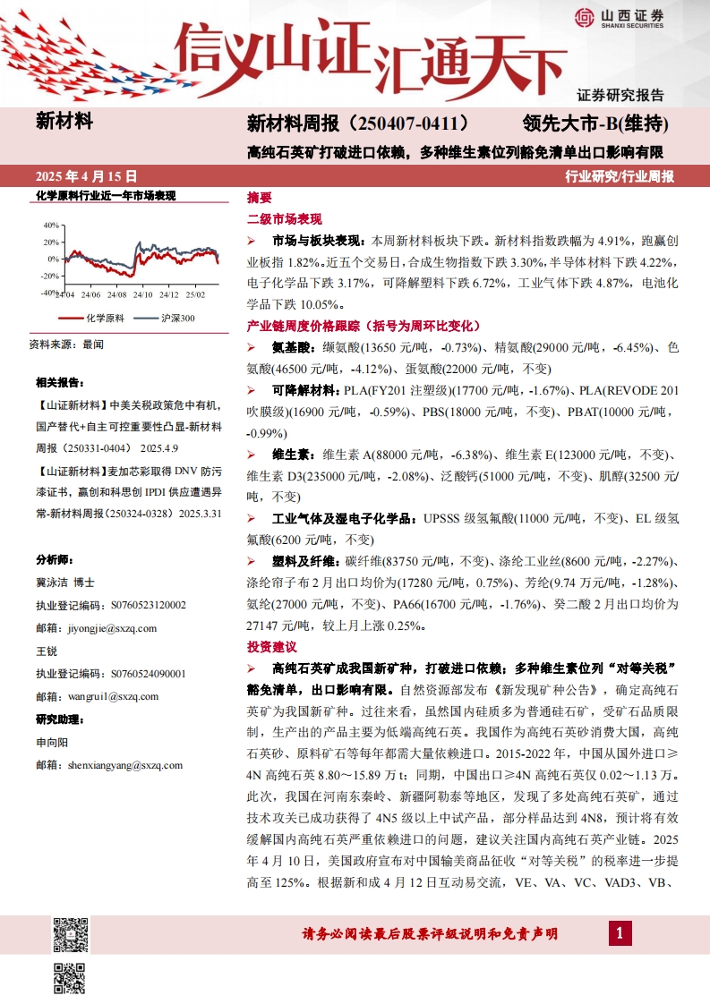 2025-04-15-山西证券-新材料行业周报:新材料周报(250407-0411)高纯石英矿打破进口依赖,多种维生素位列豁免清单出口影响有限