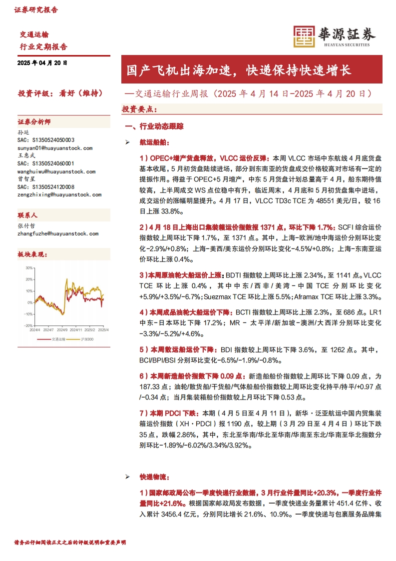 2025-04-20-华源证券--交通运输行业周报:国产飞机出海加速,快递保持快速增长