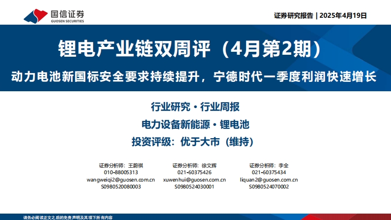 2025-04-20-国信证券--锂电产业链双周评(4月第2期):动力电池新国标安全要求持续提升,宁德时代一季度利润快速增长