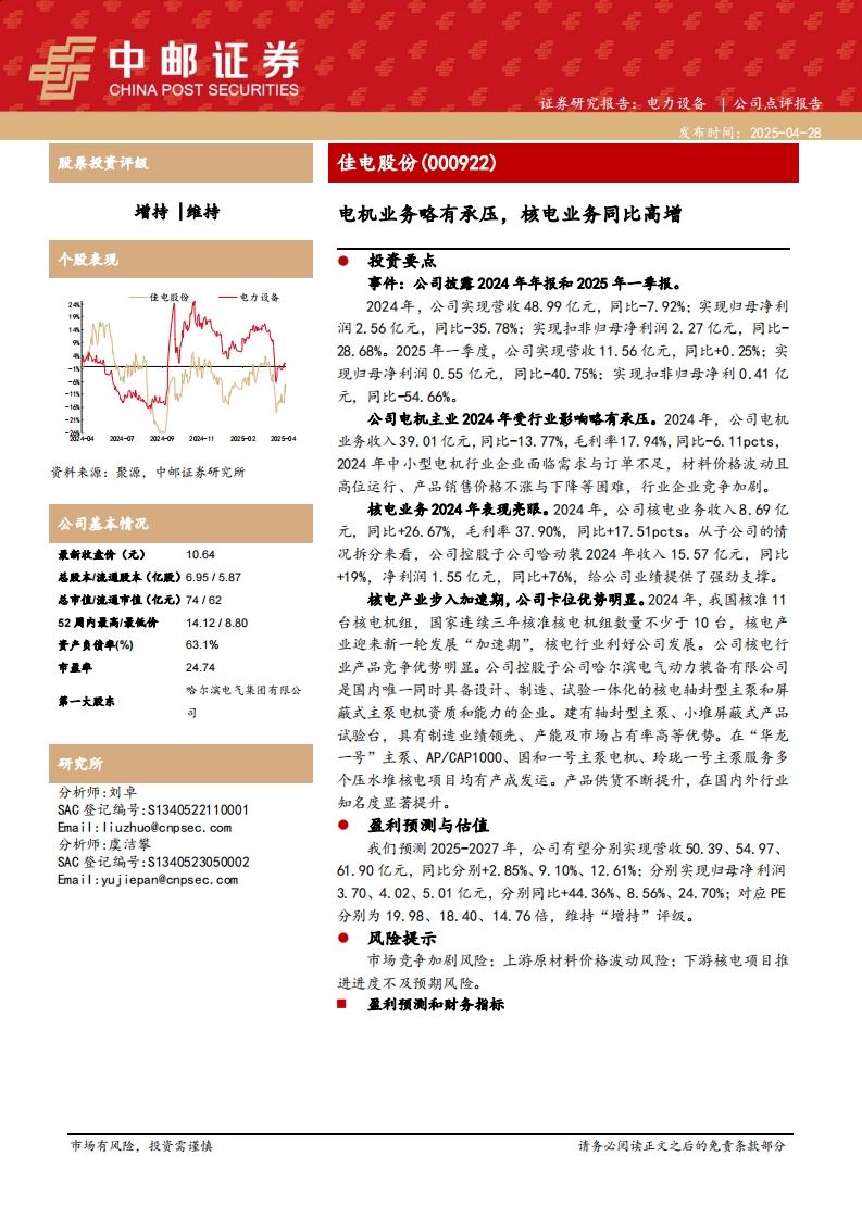 2025-04-28-中邮证券-佳电股份-电机业务略有承压,核电业务同比高增