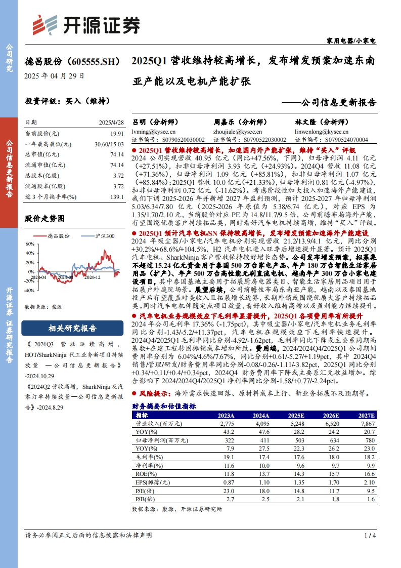 2025-04-29-开源证券-德昌股份-公司信息更新报告:2025Q1营收维持较高增长,发布增发预案加速东南亚产能以及电机产能扩张