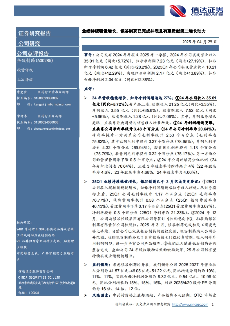 2025-04-29-信达证券-羚锐制药-业绩持续稳健增长,银谷制药已完成并表且有望贡献第二增长动力