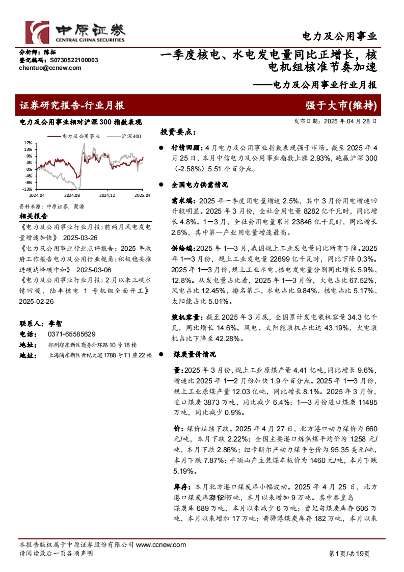 2025-04-29-中原证券--电力及公用事业行业月报:一季度核电、水电发电量同比正增长,核电机组核准节奏加速