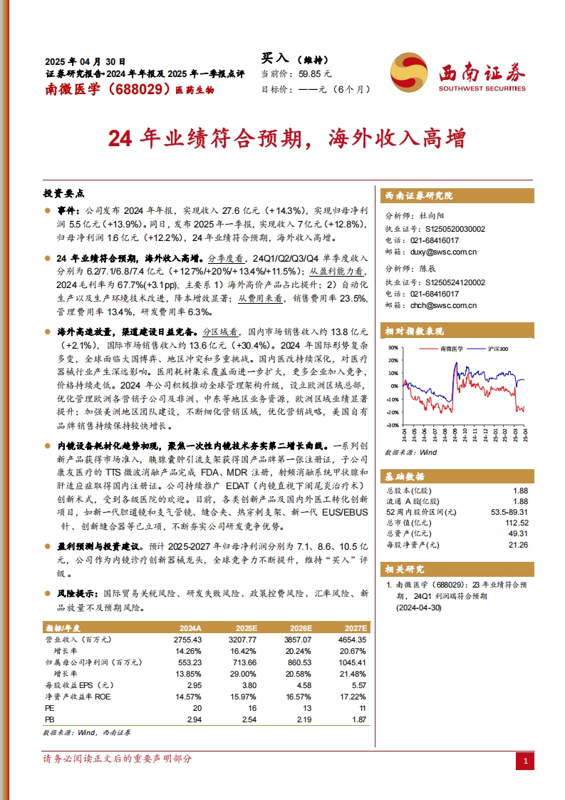 2025-05-06-西南证券-南微医学-24年业绩符合预期,海外收入高增
