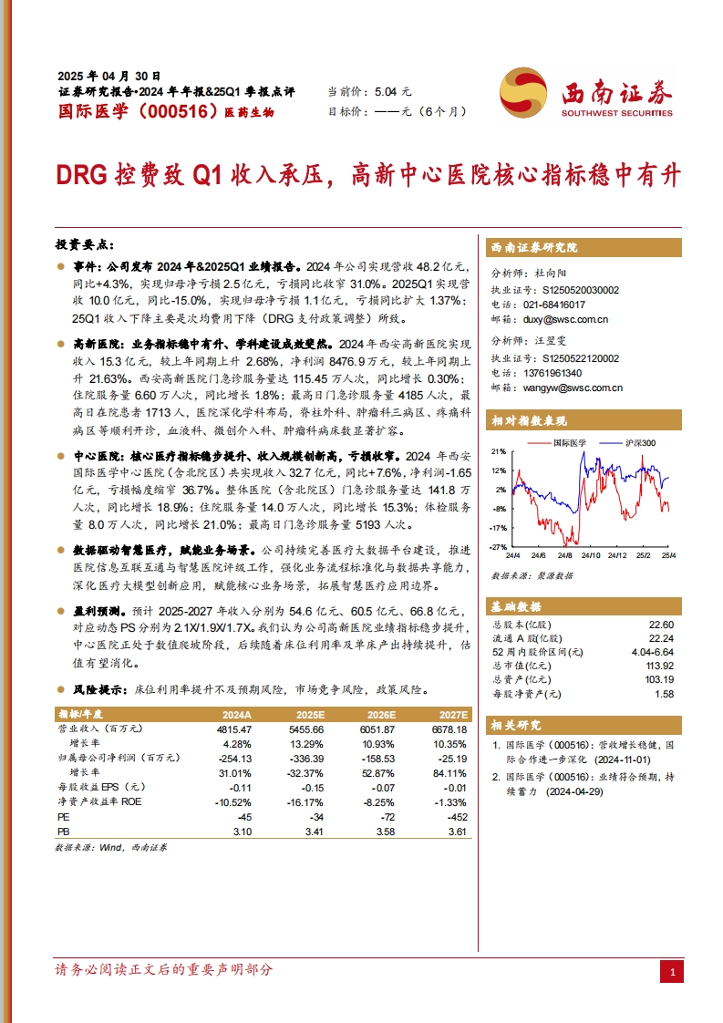 2025-05-06-西南证券-国际医学-DRG控费致Q1收入承压,高新中心医院核心指标稳中有升