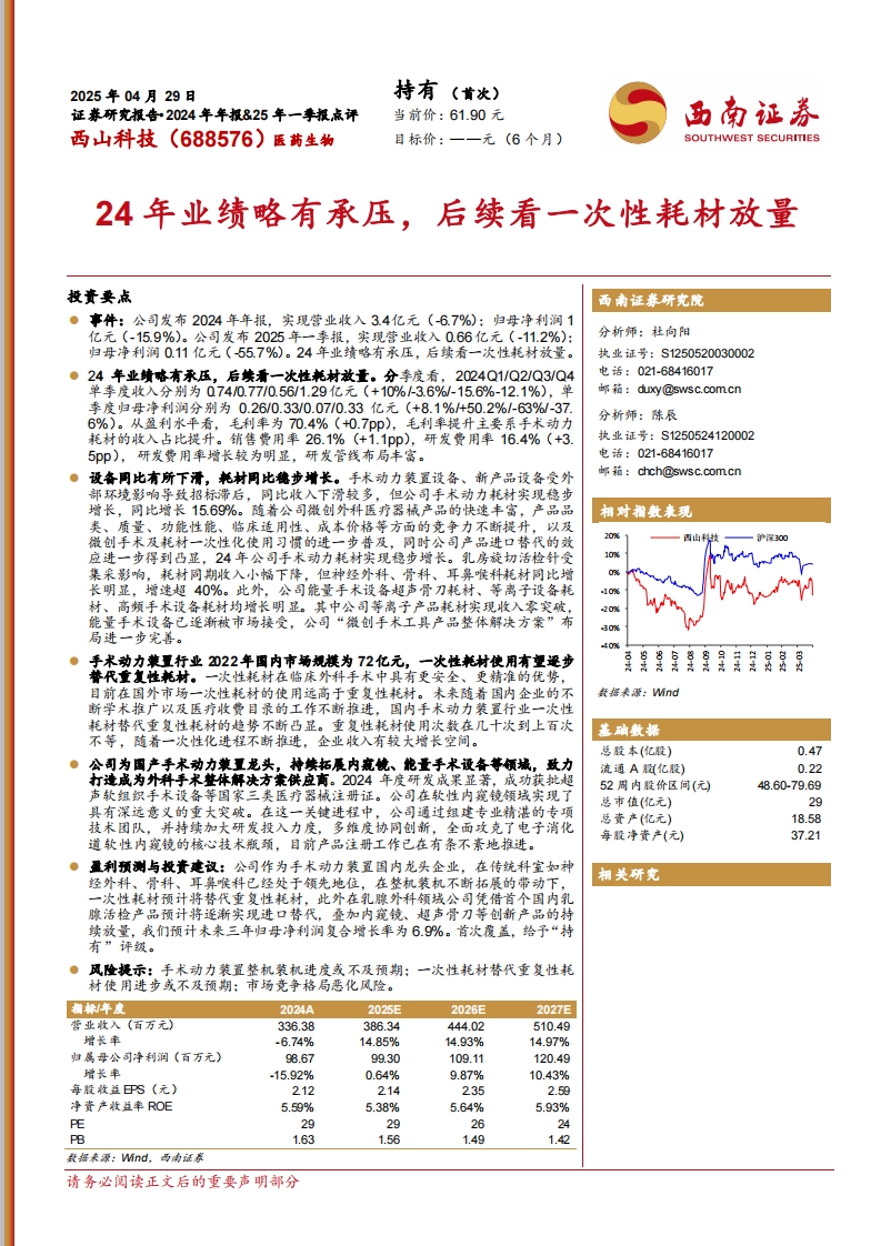 2025-05-09-西南证券-西山科技-24年业绩略有承压,后续看一次性耗材放量