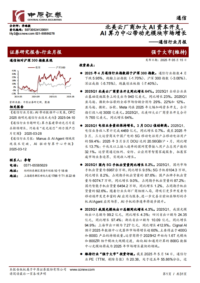 2025-05-15-中原证券-通信行业月报:北美云厂商加大AI资本开支,AI算力中心带动光模块市场增长