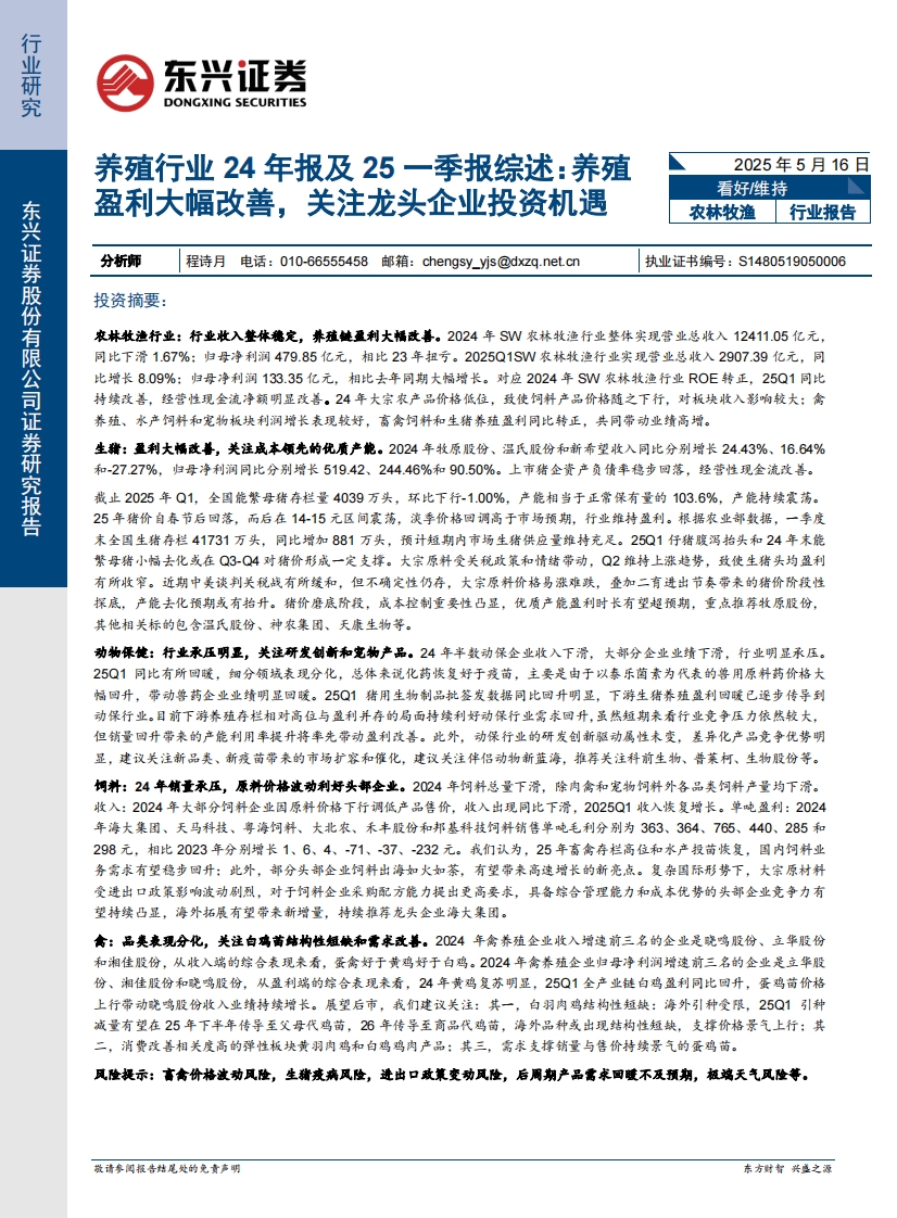 2025-05-16-东兴证券-养殖行业24年报及25一季报综述:养殖盈利大幅改善,关注龙头企业投资机遇