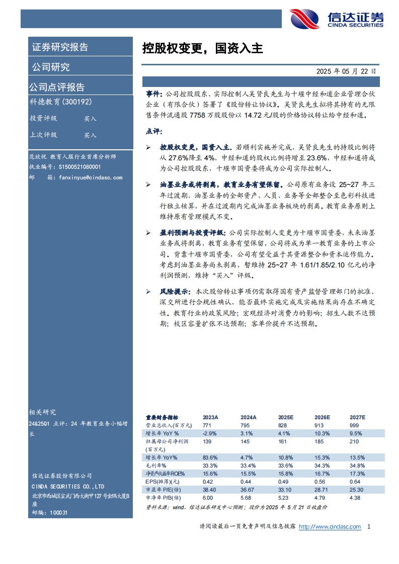 2025-05-22-信达证券-科德教育-控股权变更,国资入主