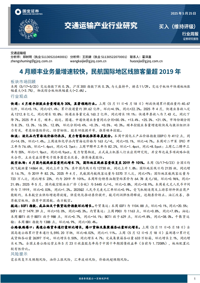 2025-05-26-国金证券-交通运输产业行业研究:4月顺丰业务量增速较快,民航国际地区线旅客量超2019年