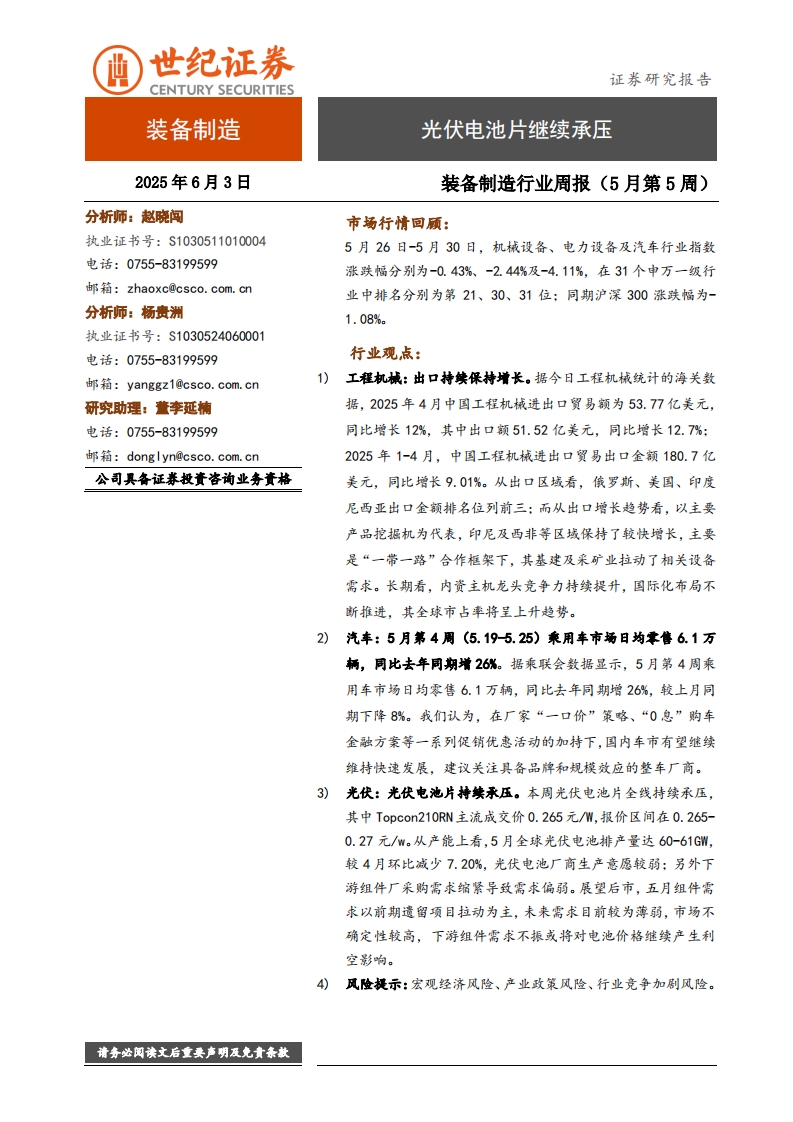 2025-06-03-世纪证券--装备制造行业周报(5月第5周):光伏电池片继续承压