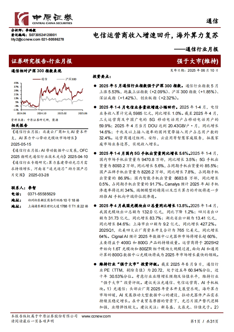 2025-06-11-中原证券-通信行业月报:电信运营商收入增速回升,海外算力复苏