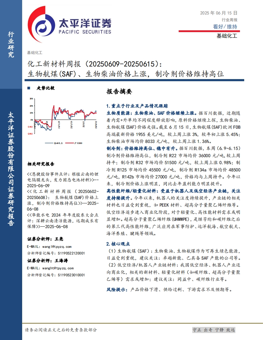 2025-06-15-太平洋--化工新材料周报:生物航煤(SAF)、生物柴油价格上涨,制冷剂价格维持高位