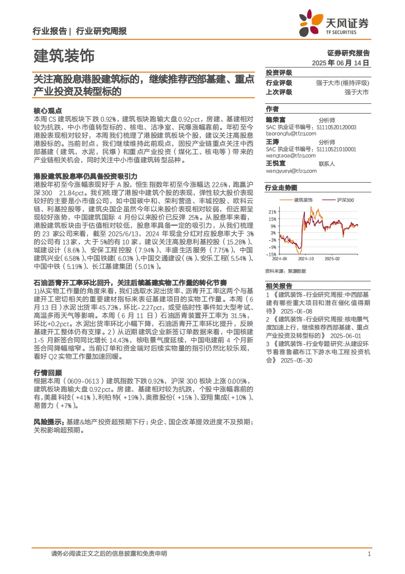 2025-06-15-天风证券--建筑装饰行业研究周报:关注高股息港股建筑标的,继续推荐西部基建、重点产业投资及转型标的