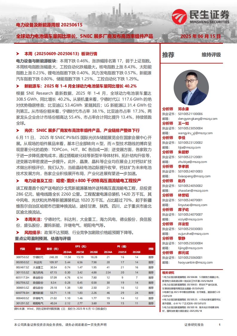 2025-06-15-民生证券--电力设备及新能源周报:全球动力电池装车量同比增长,SNEC展多厂商发布高效率组件产品