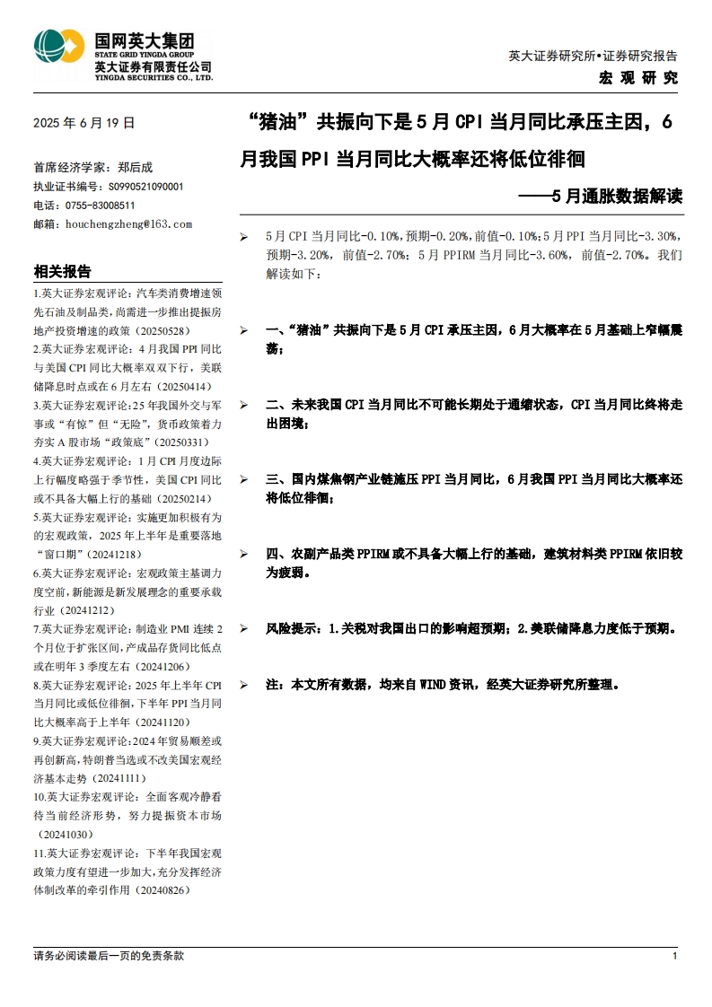 2025-06-22-英大证券-5月通胀数据解读:“猪油”共振向下是5月CPI当月同比承压主因,6月我国PPI当月同比大概率还将低位徘徊