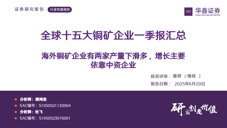 2025-06-20-华鑫证券--全球十五大铜矿企业一季报汇总:海外铜矿企业有两家产量下滑多,增长主要依靠中资企业