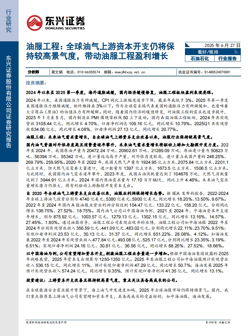2025-06-27-东兴证券-油服工程:全球油气上游资本开支仍将保持较高景气度,带动油服工程盈利增长