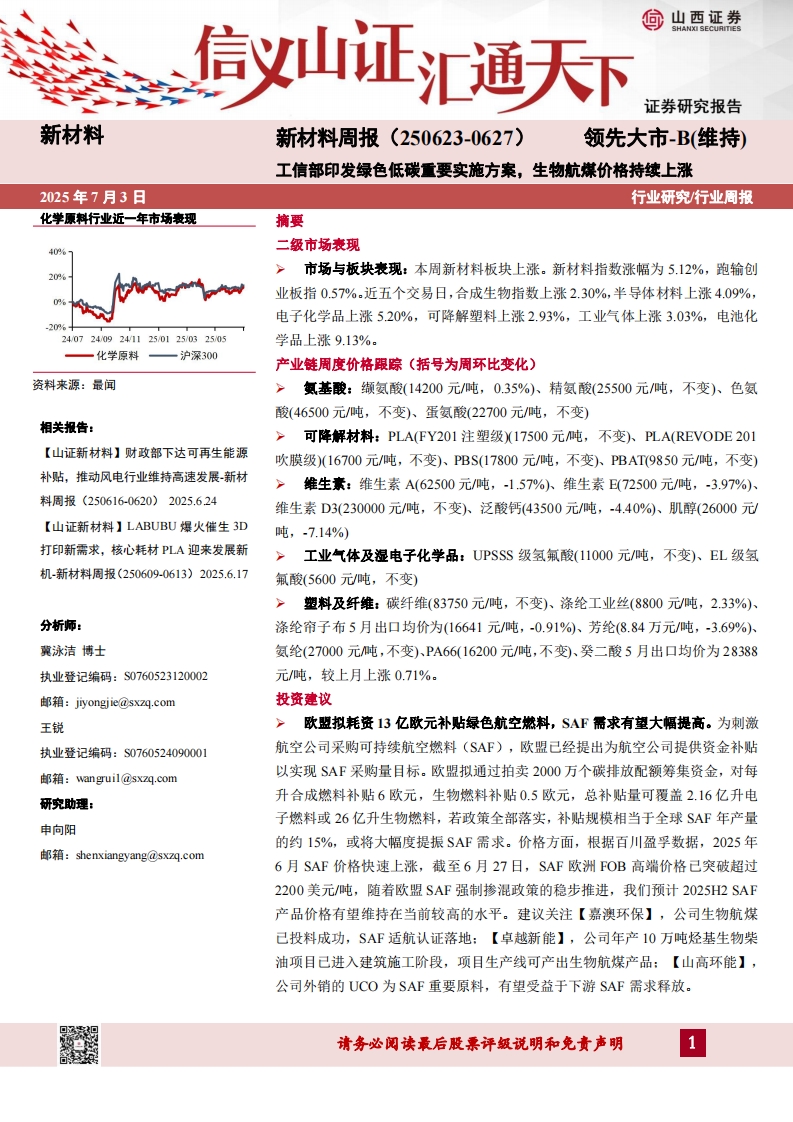 2025-07-03-山西证券--新材料周报:工信部印发绿色低碳重要实施方案,生物航煤价格持续上涨