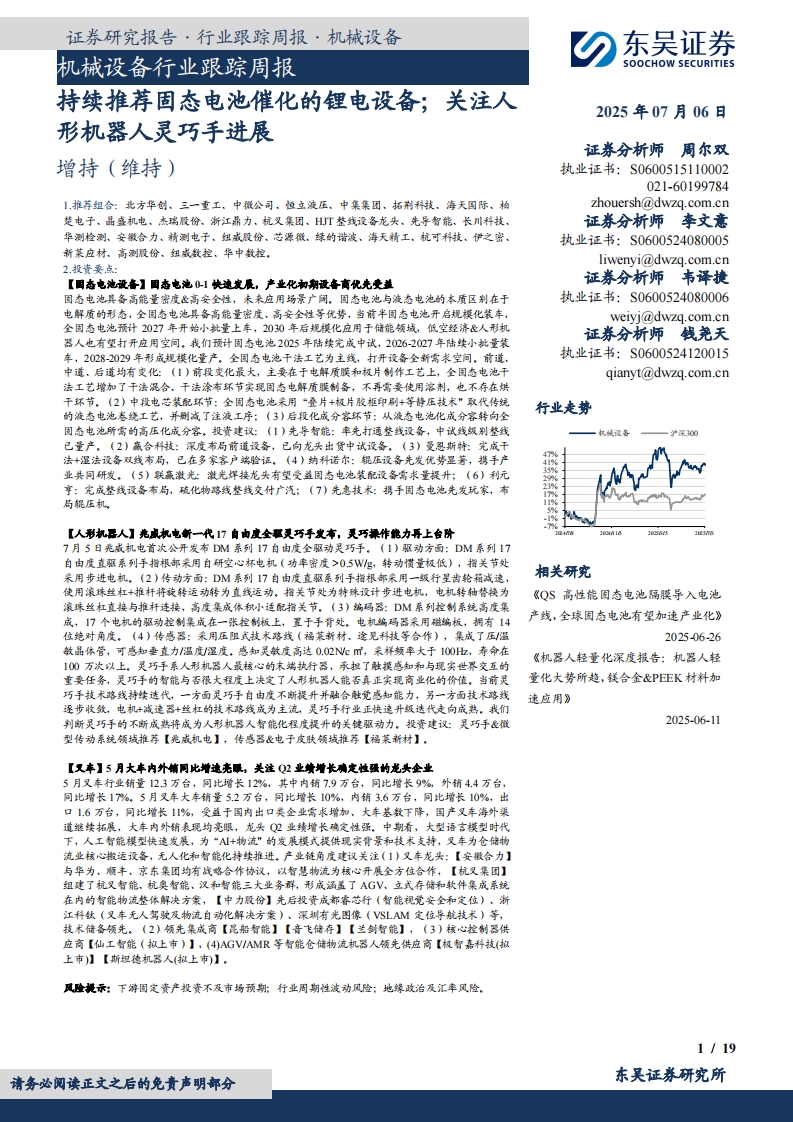 2025-07-06-东吴证券--机械设备行业跟踪周报:持续推荐固态电池催化的锂电设备;关注人形机器人灵巧手进展