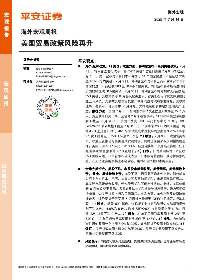2025-07-14-平安证券-海外宏观周报:美国贸易政策风险再升