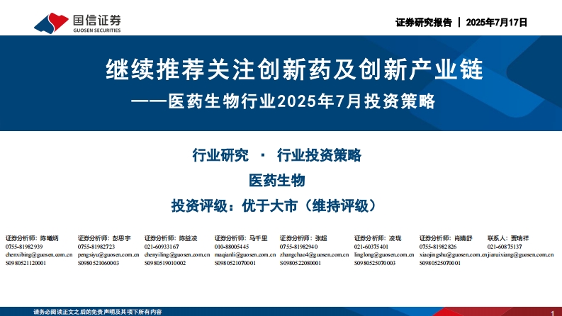 2025-07-18-国信证券--医药生物行业2025年7月投资策略:继续推荐关注创新药及创新产业链
