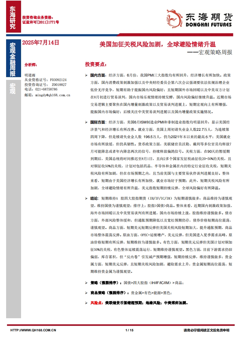 2025-07-16-东海期货-宏观策略周报:美国加征关税风险加剧,全球避险情绪升温