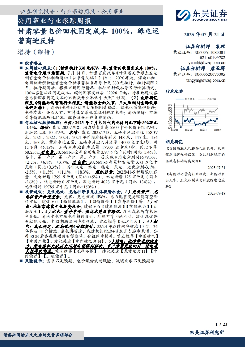 2025-07-21-东吴证券--公用事业行业跟踪周报:甘肃容量电价回收固定成本100%,绿电运营商迎反转