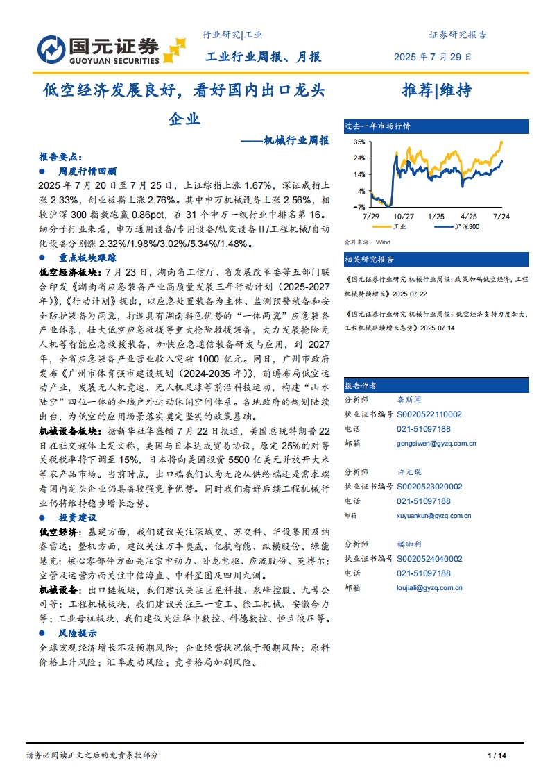 2025-07-29-国元证券--机械行业周报:低空经济发展良好,看好国内出口龙头企业
