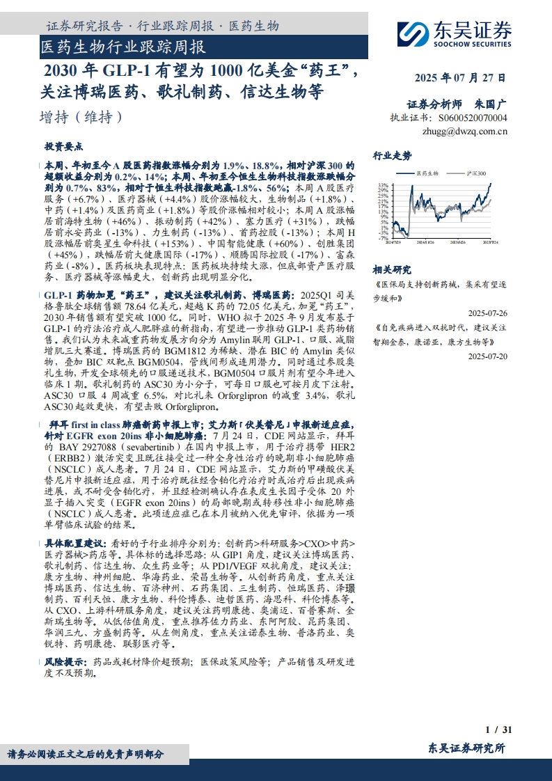 2025-07-27-东吴证券--医药生物行业跟踪周报:2030年GLP-1有望为1000亿美金“药王”关注博瑞医药、歌礼制药、信达生物等