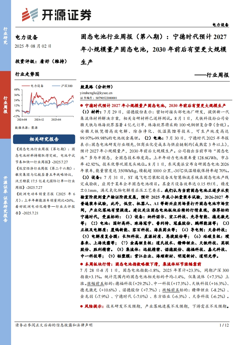 2025-08-03-开源证券--电力设备行业周报:固态电池行业周报(第八期):宁德时代预计2027年小规模量产固态电池,2030年前后有望更大规模