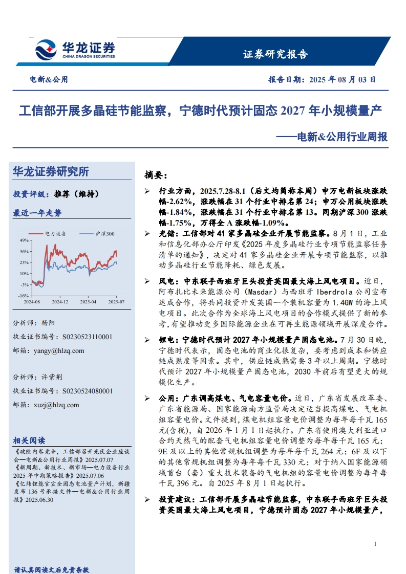 2025-08-05-华龙证券--电新&公用行业周报:工信部开展多晶硅节能监察,宁德时代预计固态2027年小规模量产