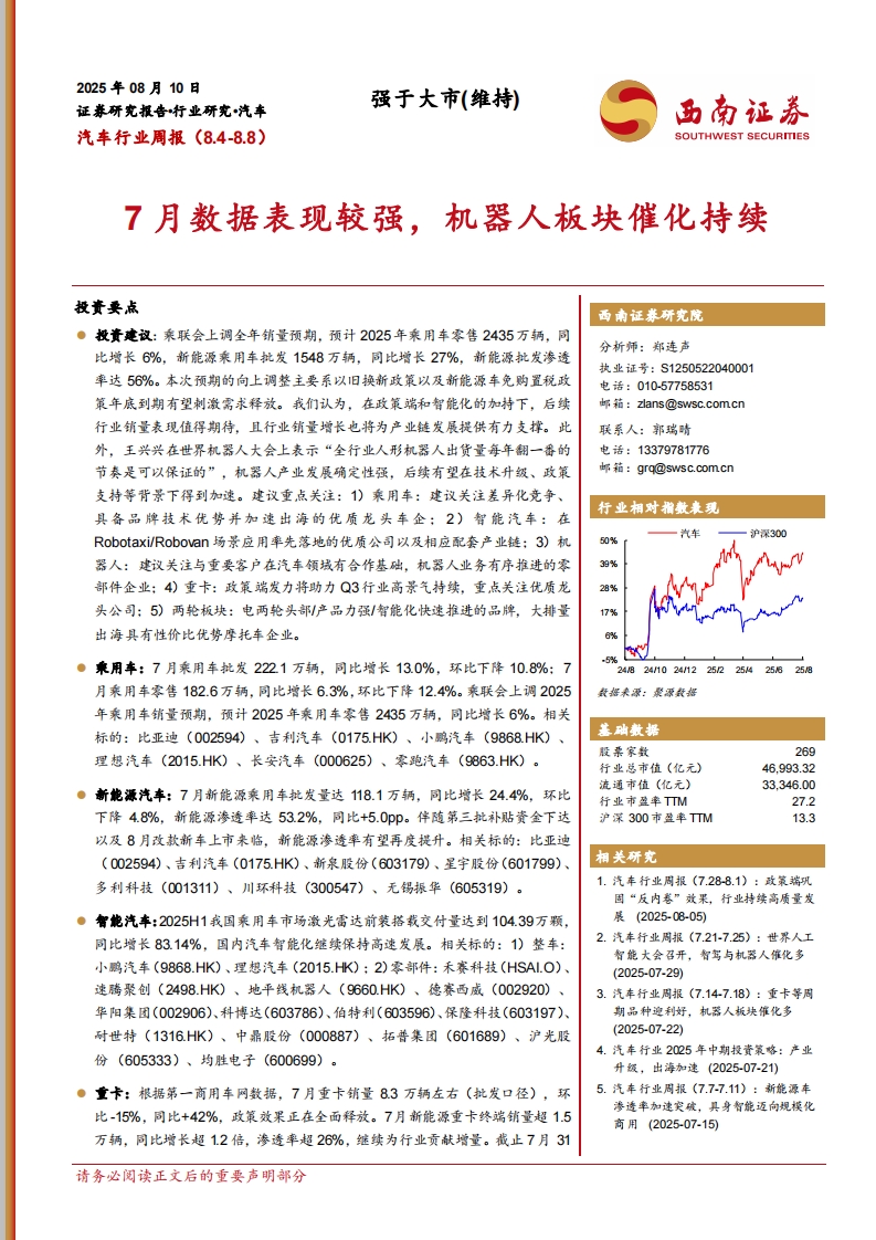 2025-08-12-西南证券--汽车行业周报:7月数据表现较强,机器人板块催化持续
