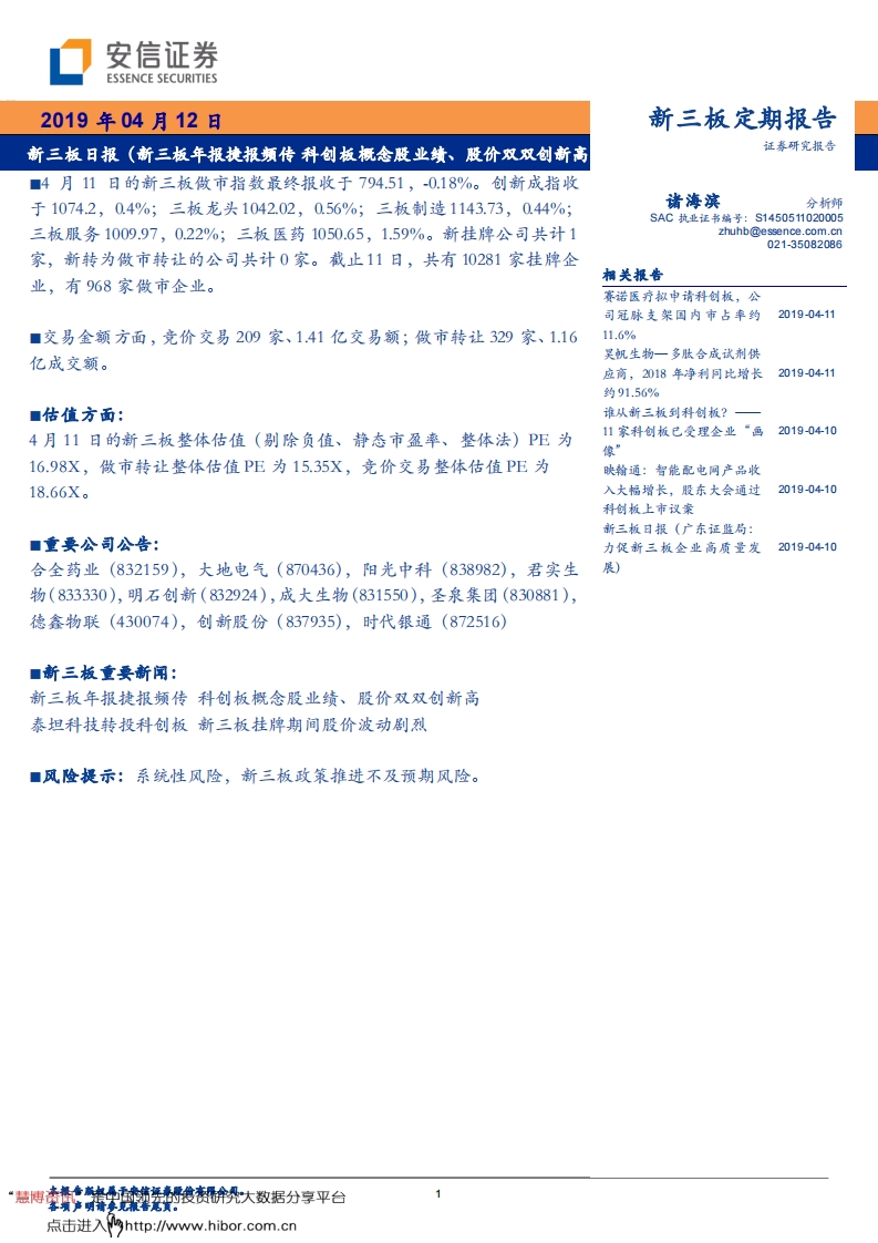 20190412-安信证券:新三板日报-新三板年报捷报频传科创板概念股业绩、股价双双创新高-10页