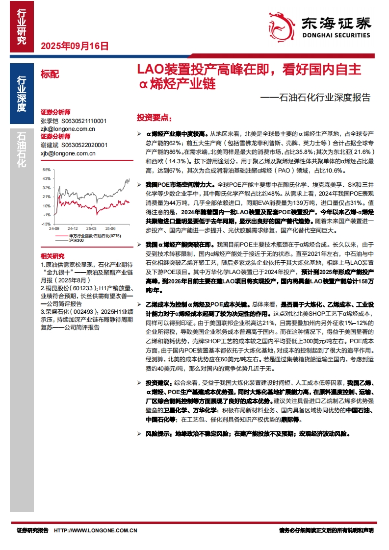 2025-09-16-东海证券--石油石化行业深度报告:LAO装置投产高峰在即,看好国内自主α烯烃产业链