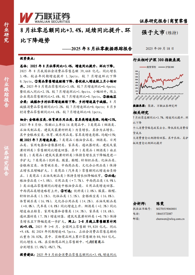 2025-09-19-万联证券--商贸零售行业2025年8月社零数据跟踪报告:8月社零总额同比+3.4%,延续同比提升、环比下降趋势